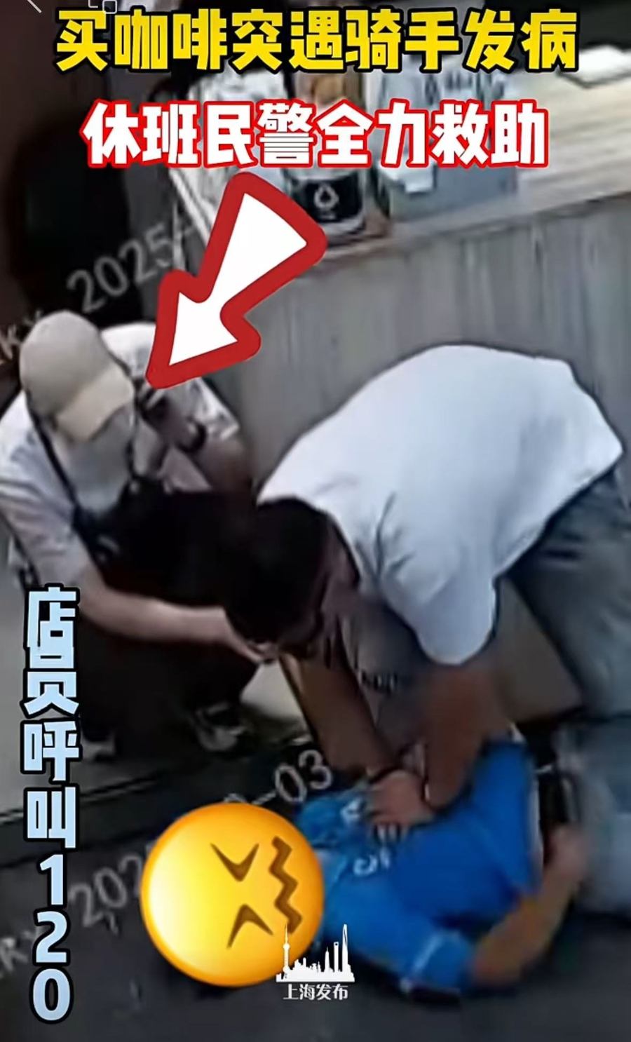 10月2日下午,上海轨交公安分局休班民警宋王缘在咖啡店取咖啡时,发现一外卖骑手突然抽搐倒地意识不清。