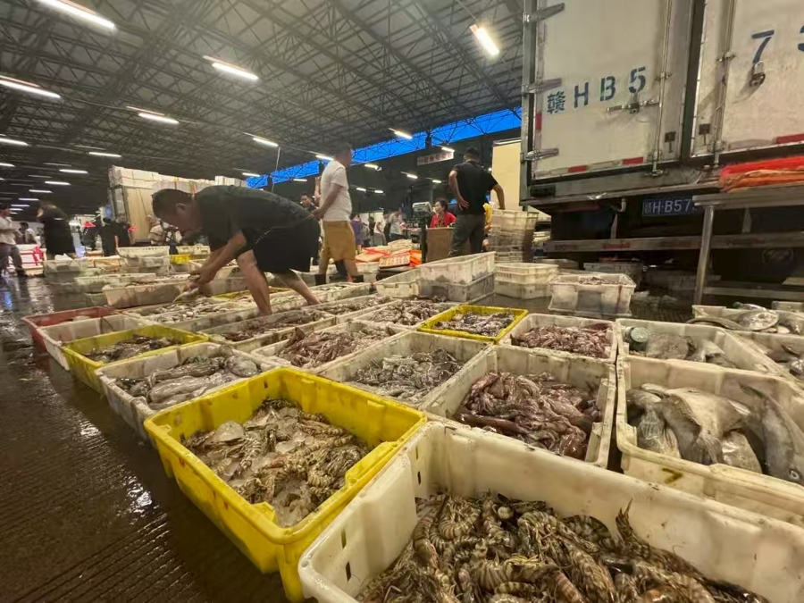 9月17日17时30分,大水产交易区已经挤了不少“抢鲜大军”——来自全市的中小采购商、餐饮企业和市民。载着“东海第一网”的冷链车驶入交易区,工人们麻利地卸下一箱箱带着海腥味的泡沫箱,等候多时的采购商忙着看货、下单,一车货不到半个小时就抢购一空。