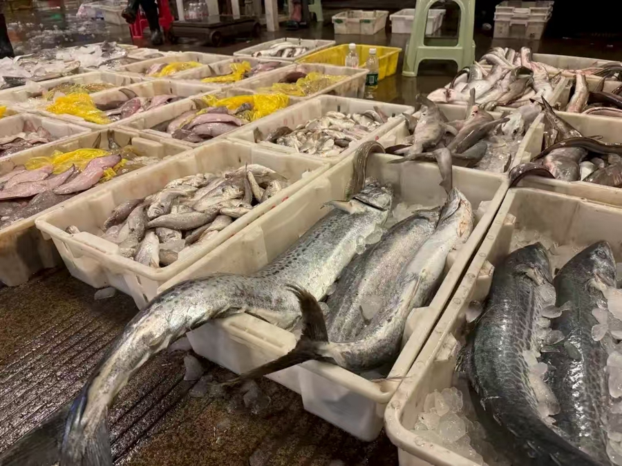 在交易区,不时能见到条重约20斤的鮸鱼、15斤左右的马鲛鱼等“大块头”海鲜。一位经营户展示大鮸鱼时说,“到货量大,价格实惠,原来卖50元一斤,现在降到35元一斤。”